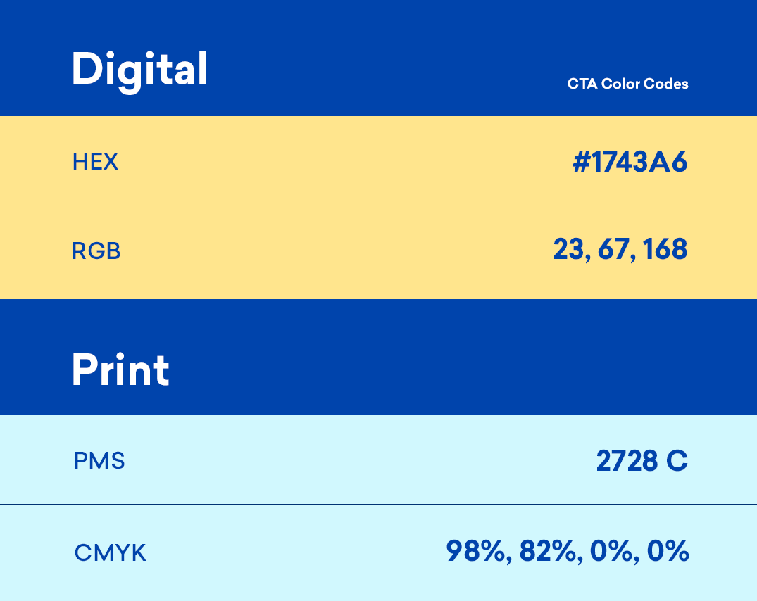 The acronym ‘PMS’ refers to the Pantone Matching System which is a standard in the printing industry. In order to maintain the integrity of the CTA identity and to provide consistency in color, we request that when printing in one-color you use PMS 2728 C, when printing in 4-color you use the following build (C=98 M=82 Y=0 K=0), and when showing in RGB you use the following build (R=23 G=67 B=168). The equivalent web and digital color is #1743A6.