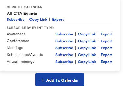 Our cta.org calendar houses events, trainings, conferences, and more organized by our union. We also have expanded functionality that also allows you to add everything to your personal calendar in three ways. We have some general guidelines below; however, there are many variables with personal calendars. If the instructions below do not work for you, please feel free to contact us via our Help Center.