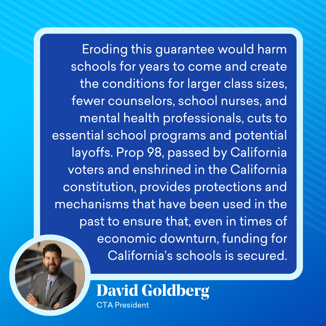 “As always, we will closely monitor any attempt to weaken the constitutional protections behind the Proposition 98 funding guarantee. Eroding this guarantee would harm schools for years to come and create the conditions for larger class sizes, fewer counselors, school nurses, and mental health professionals, cuts to essential school programs and potential layoffs. All while California is in the bottom half of per pupil spending in the country. Proposition 98, passed by California voters and enshrined in the California constitution, provides protections and mechanisms that have been used in the past to ensure that, even in times of economic downturn, funding for California’s schools is secured.