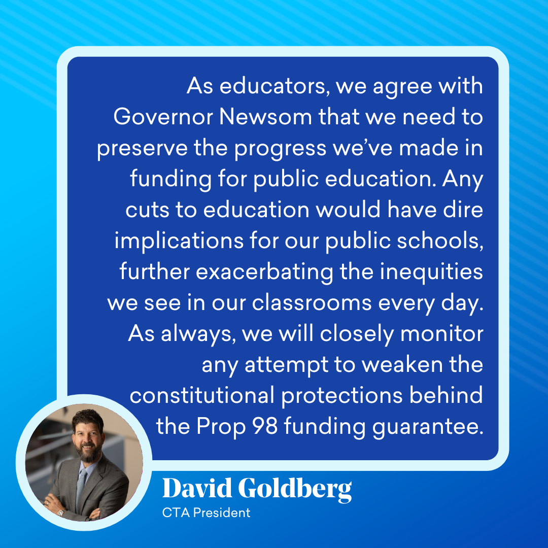 “As educators, we agree with Governor Newsom that we need to preserve the progress we’ve made in funding for public education. Any cuts to education would have dire implications for our public schools, further exacerbating the inequities we see in our classrooms every day.