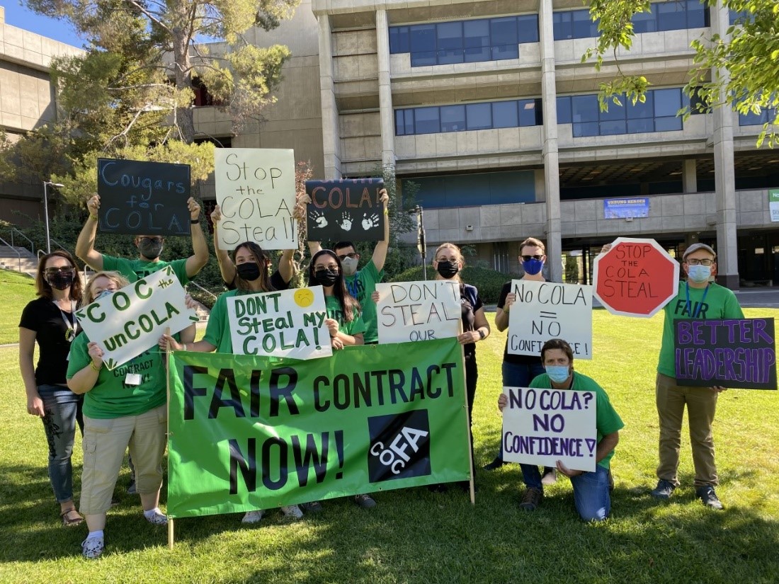 After the district offered 3 percent of the 5.07 percent cost-of-living adjustment (COLA) in negotiations, the College of the Canyons Faculty Association (COCFA) started organizing protests before two board of trustees meetings, and nine faculty submitted written comments or spoke at board meetings. Faculty rallied around the need for full COLA to keep pace with increased costs for basic items, health and welfare. There were significant organizing activities with messaging and social media campaigns around the need for an equitable raise that included full COLA at 5.07 percent, not a watered-down amount, in order to keep faculty in a competitive wage for the economy. There was informational picketing at the board of trustees meeting, and the board did authorize district management to offer full COLA (5.07 percent), plus a bit more for health and welfare, to total 5.26 percent.