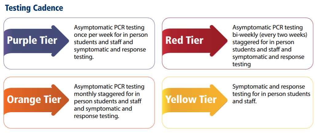 - Asymptomatic Testing – Testing is an essential layer of the mitigation strategies. Early identification and isolation of COVID-19 cases without symptoms through regular testing helps prevent outbreaks by checking if the mitigation strategies are working and improving understanding of infection risks in schools. In addition to symptomatic testing and response in all districts, the plan calls for asymptomatic PCR testing of all staff and students every week for schools in the Purple Tier, bi-weekly asymptomatic PCR testing in the Red Tier and monthly in the Orange Tier.