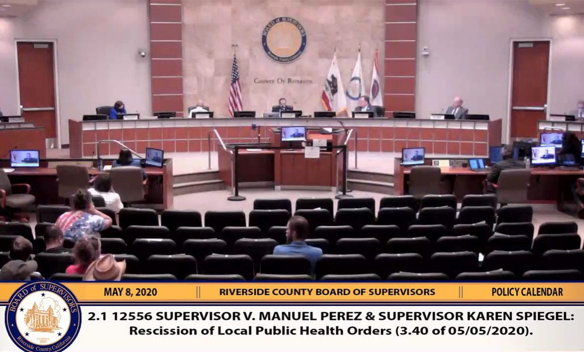 Under substantial pressure from local business owners, restaurateurs, and religious leaders pleading for an end to the shutdown and restrictions on mass gatherings, Riverside County Board of Supervisors (BOS) voted 5-0 to rescind county and state health guidelines and begin re-opening.