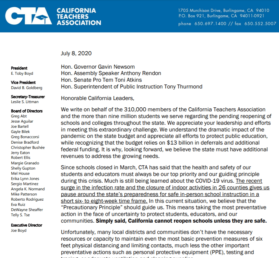 Today, Los Angeles and San Diego unified school districts—the largest school districts in California—announced that school will resume next month fully online, citing “skyrocketing infection rates” and agreeing with CTA that the health and safety of students, educators and communities cannot be compromised by reopening schools. This announcement comes after last week’s poll by United Teachers Los Angeles (UTLA) that showed 83 percent of educators did not want to physically return to classrooms.