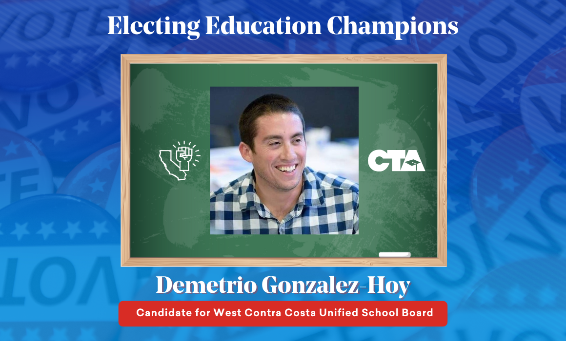 Meet one of these education champions: Demetrio Gonzalez-Hoy, CTA field staff and former bilingual educator, who is running for re-election to the West Contra Costa Unified School Board.