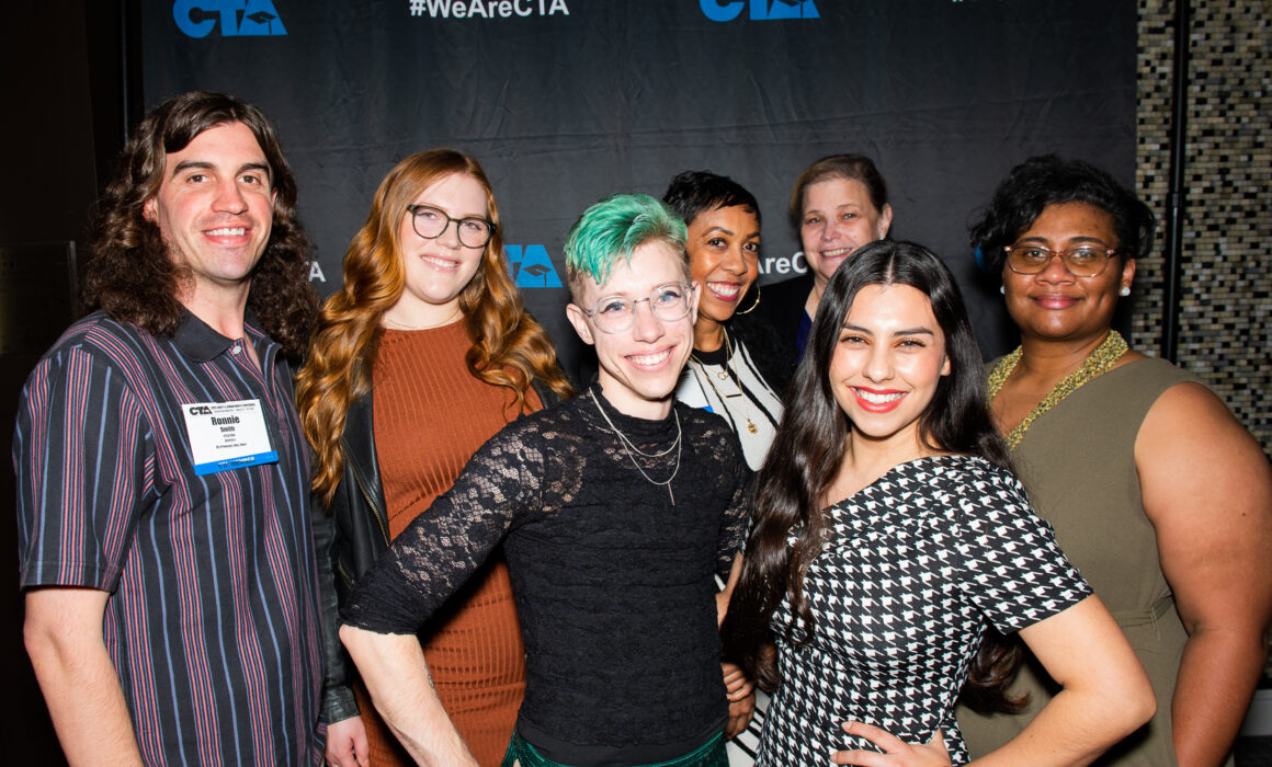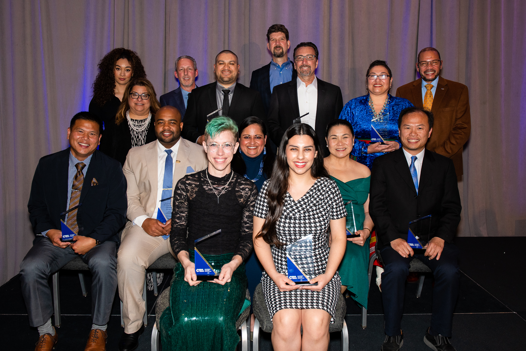 CTA’s 2023 Human Rights Awards – standing at the top, from left: Melissa Fitzgerald, CTA Secretary-Treasurer Leslie Littman, Geoff Morganstern, Ron Espiritu, CTA Vice President David Goldberg, Grant Shuster, Vanessa Yava, CTA President E. Toby Boyd; seated from left: Frank Palad Mata, Nalik Davis Jr., Skye Tooley, Gretel Rodriguez, Stacey Yakimowich Chavez, Jeanna Tang, Dr. Phe X Bach. Photo: Chris Robledo