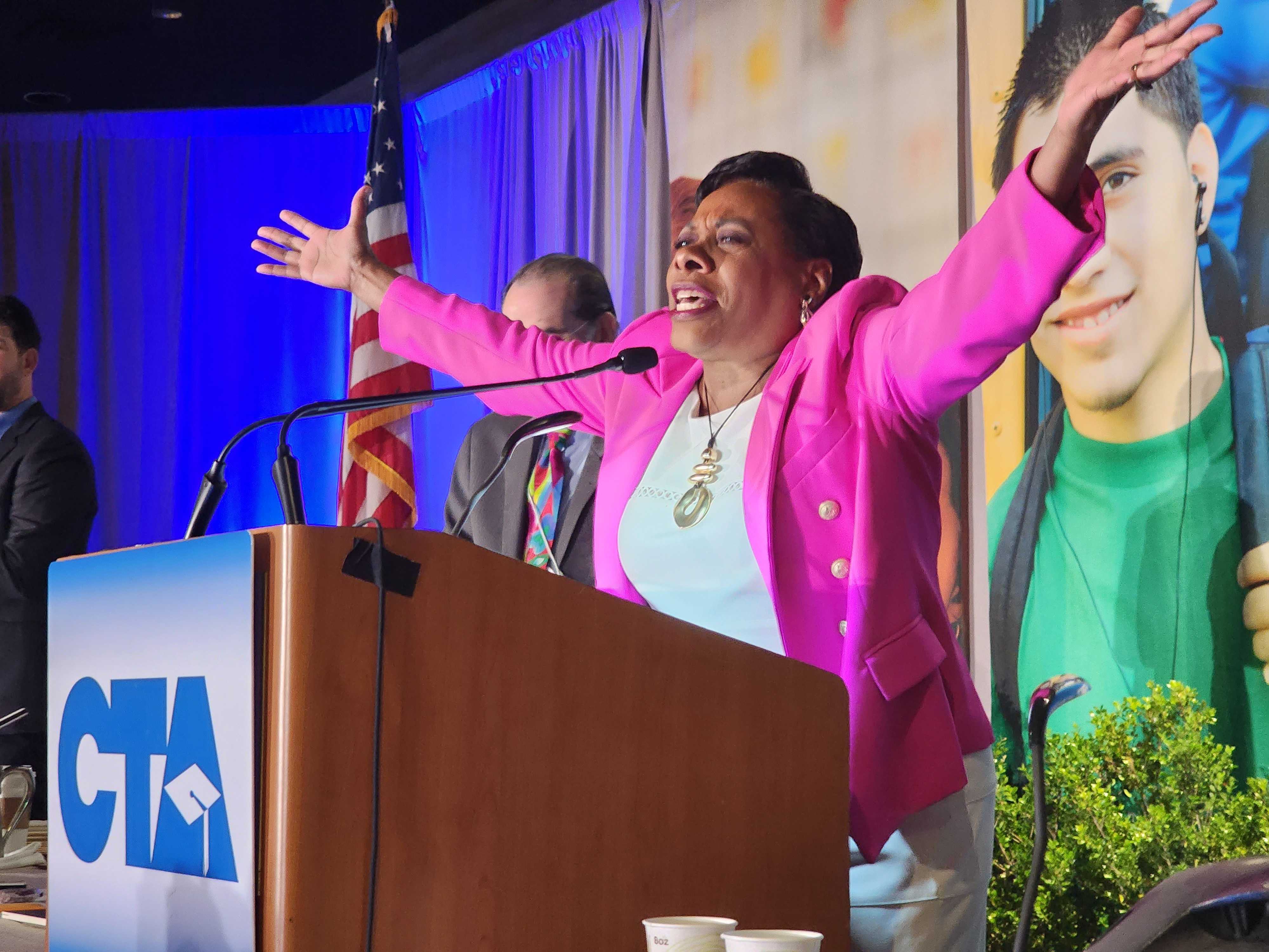 “When we are up against powerful forces with you, the mighty CTA, leading the way and joining with 3 million members across this nation, our hearts will be filled, our soul will be replenished and our strength will be renewed,” Pringle said, bringing the entire room to its feet. “Our resolve will never be broken!”