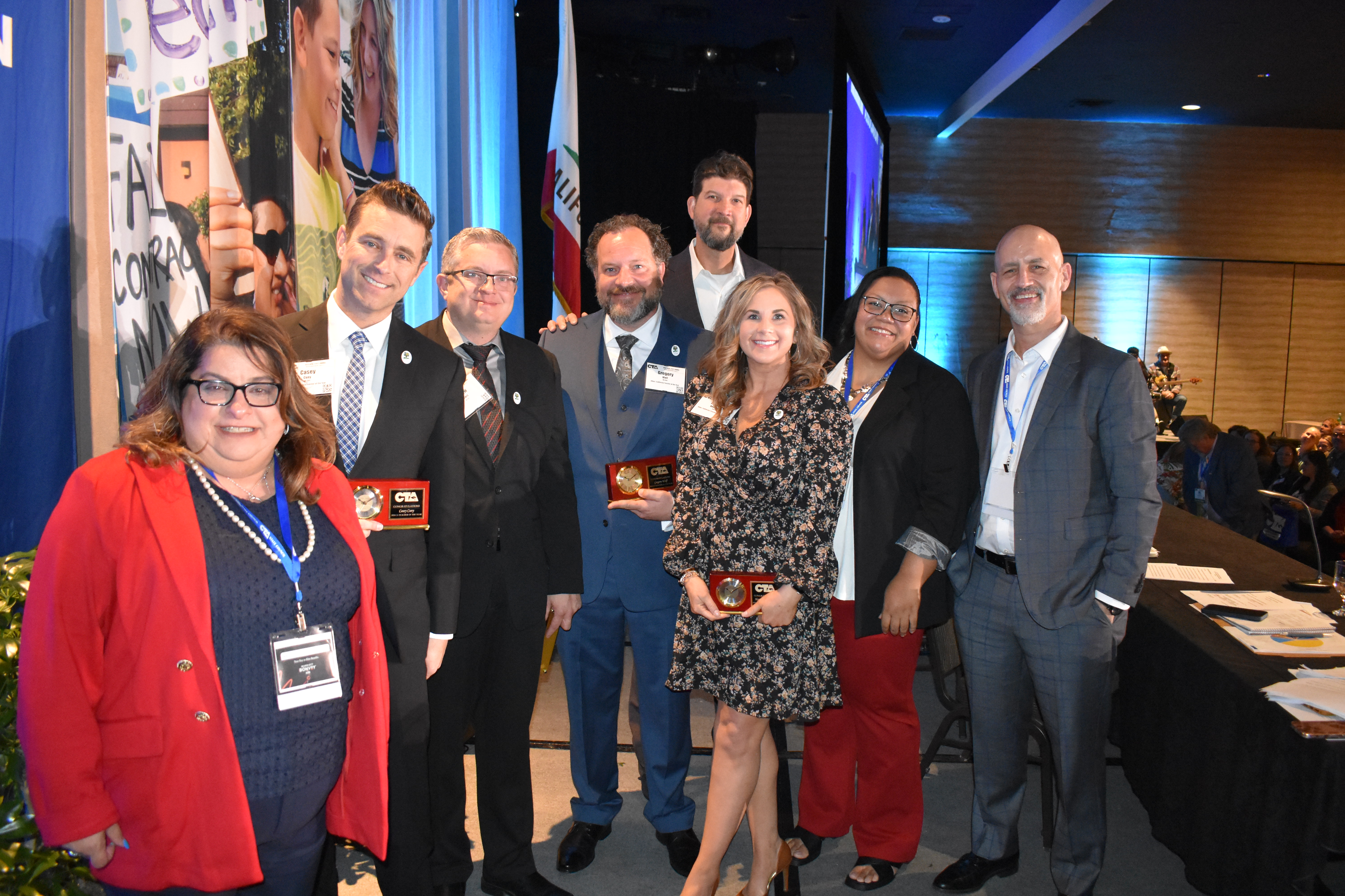 CTA State Council celebrated the 2024 California Teachers of the Year: Joseph Alvarico, engineering teacher and member of Mt. Diablo Education Association; Drew Lewis, music educator and member of United Teachers Los Angeles; Hannah Rodriguez, pre-K special education teacher and member of Duarte Unified Education Association; Gregory Wolf, history and political science teacher and member of Santa Ynez Valley Teachers Association; and Casey Cuny, honors English teacher and member of Hart District Teachers Association. Cuny was also selected by State Superintendent Tony Thurmond to represent California in the National Teacher of the Year competition.
