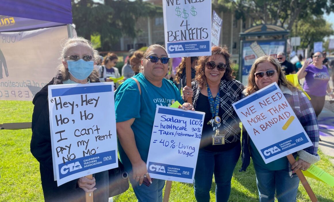 Members of the Association of Educational Office and Technical Employees (AEOTE) rallied last week as they continue to fight for a monthly stipend to help offset the cost of Hayward Unified School District’s expensive healthcare plan.