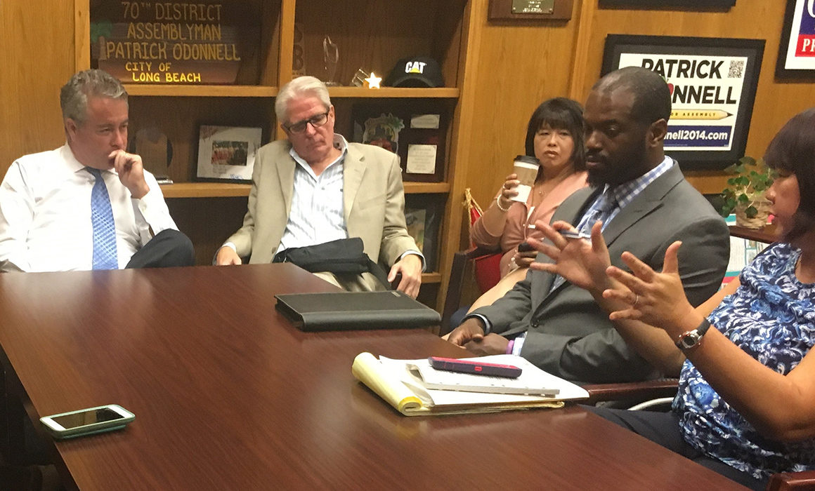 Angie Wei of the California Labor Federation, far right, expresses concerns about AB 1217 to Assembly Member Patrick O’Donnell (in white shirt). At the table are representatives of a broad coalition of education, labor and civil rights groups urging opposition to the bill, including Eric Harris, Sacramento NAACP; Jai Sookprasert, California School Employees Association; Christina Marcellus, Small School Districts Association; Sara Bachez, California Association of School Business Officials; and CTA’s Seth Bramble. (O’Donnell’s chief of staff and consultants to the Assembly Education Committee are also present.)
