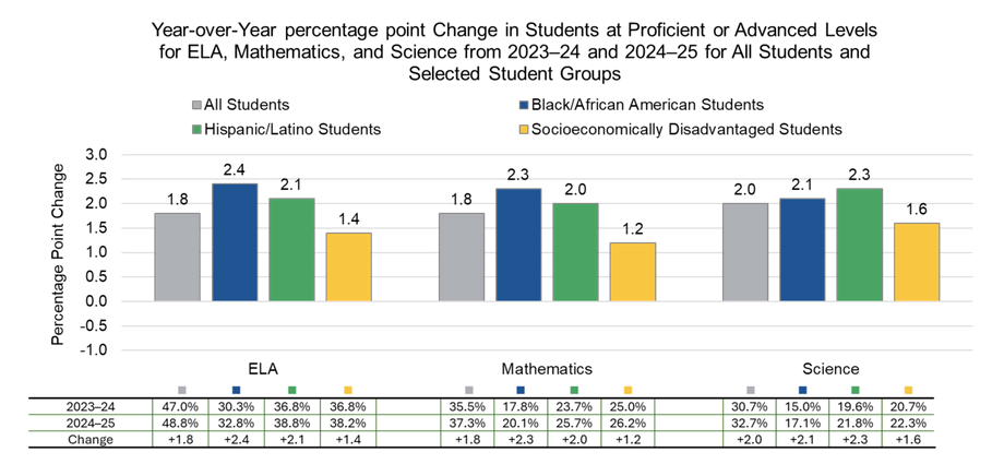 In total, the proportions of students meeting grade-level expectations also grew to 70.6% in ELA, 61% in mathematics, and 86% in science.