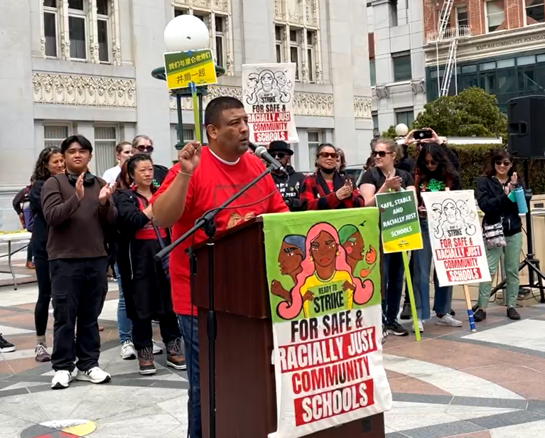 At today’s midday rally at Oakland City Hall, Armendariz said Oakland educators will be on the picket lines again tomorrow morning, fighting for their students.