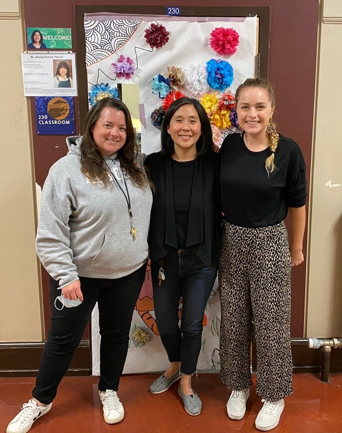 Elyse Johansson, Lena Hwang and Rachel Herrera at Aptos Middle School in San Francisco. Hwang is a mentor teacher; Johansson was her resident teacher last year and now teaches at Aptos, and Herrera is Hwang’s current resident teacher.