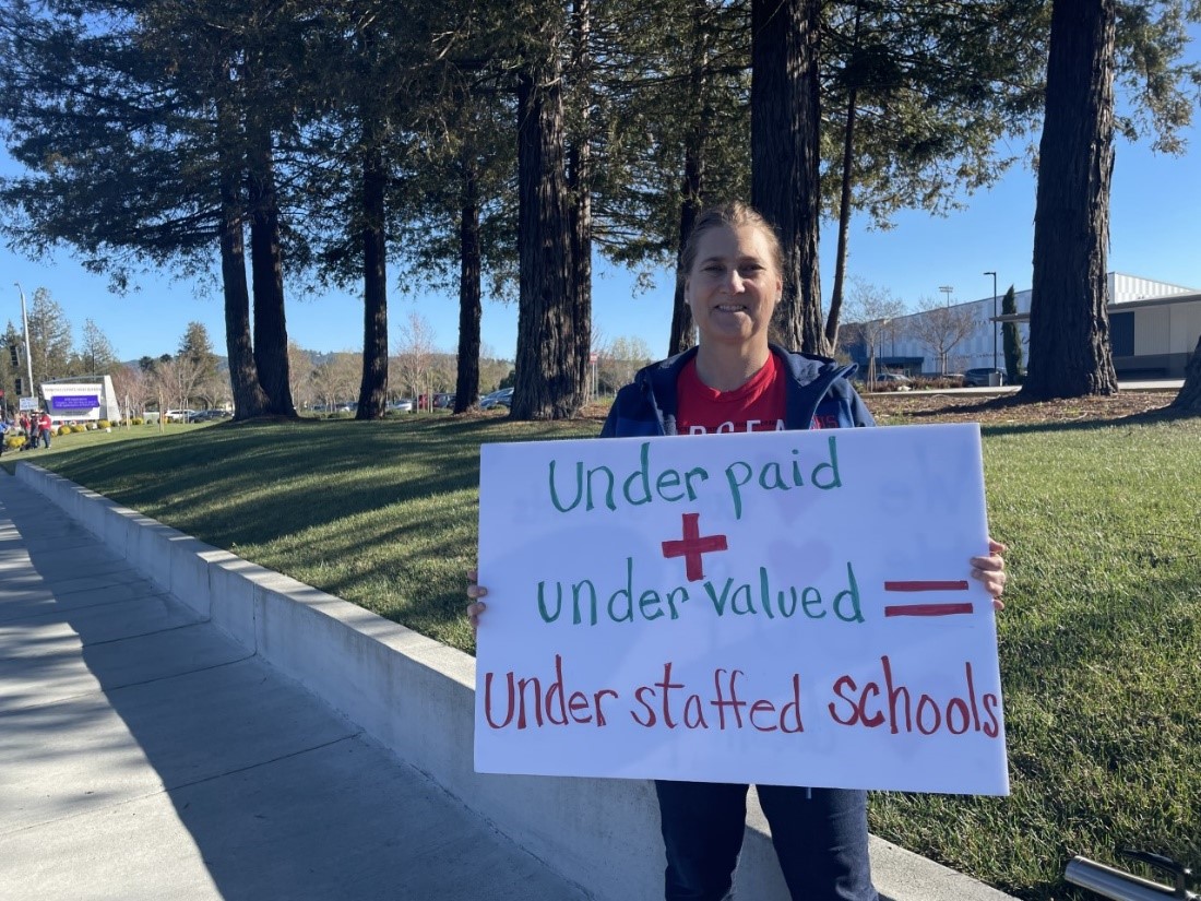 Anna Leemon is in her fourth year of being a chemistry and AP chemistry teacher at Rancho Cotate High School. “Doing this is really hard, because in a way it feels like we are abandoning our students. My first and foremost position is to teach and be a teacher, but I’m not a teacher who pretends that my subject area is the most important thing in the world. There are more important things than chemistry, and one of those is being a citizen, being involved, and standing up for what you believe in. I hope I am being a good role model for my students to learn those skills. I can barely afford my rent as it is, and I constantly feel like an afterthought here. The fact that I can’t afford basic expenses is just unacceptable, and that’s what we’re fighting for.”
