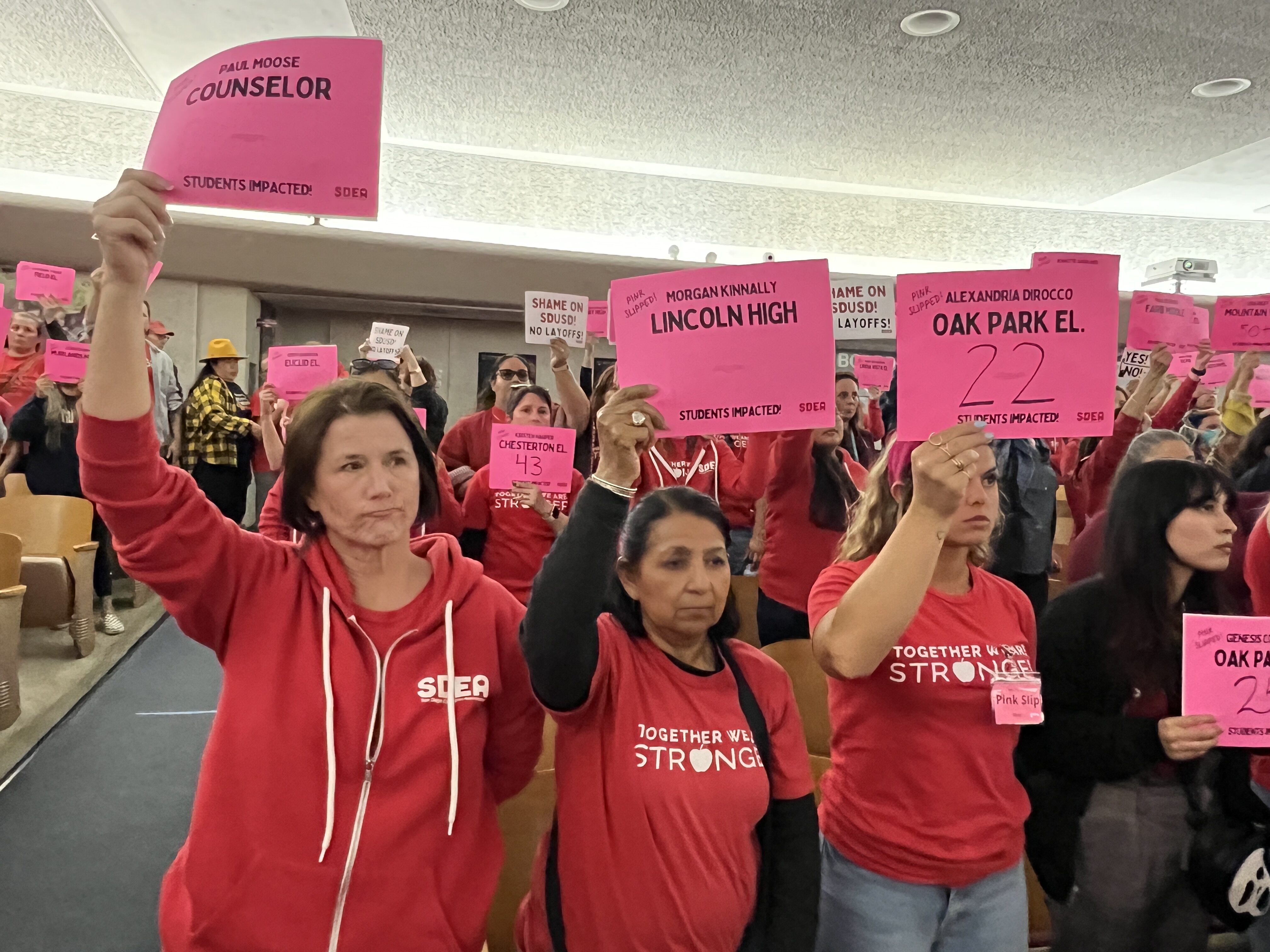 At a school board meeting, SDEA members held “pink slips” received by educators, along with the number of students who will be impacted by their layoffs.