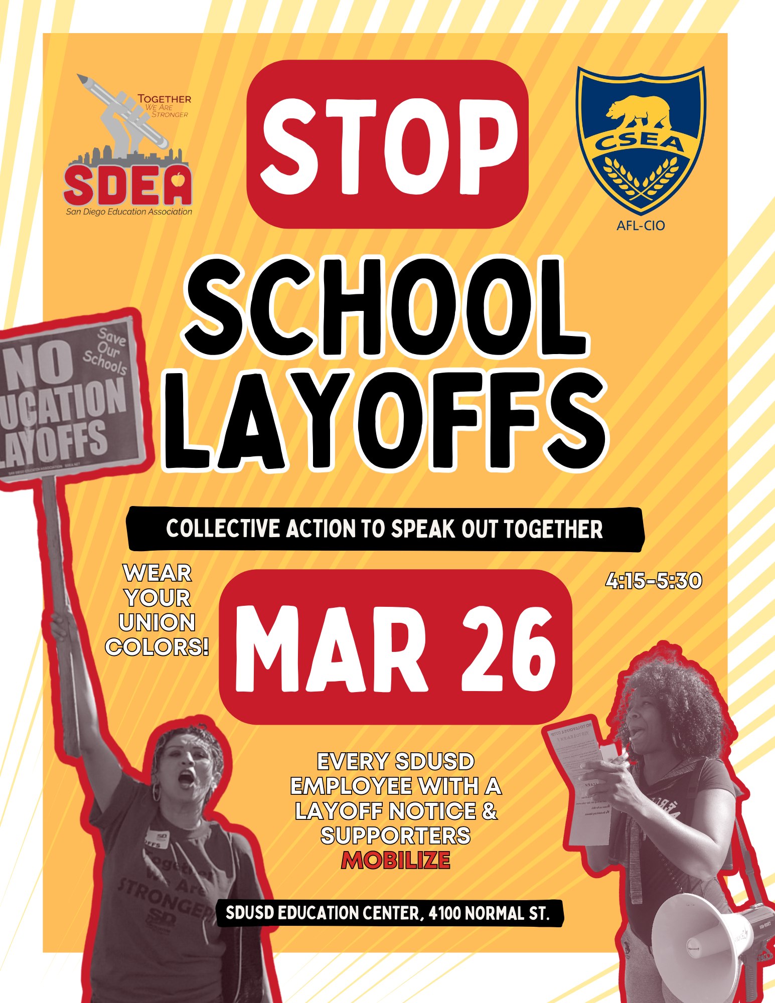 CTA local associations are already organizing to fight back layoff proposals. Anaheim Secondary Teachers Association held a march and rally in March to shine a light on the impacts of more than 100 proposed layoffs, while San Diego Education Association (SDEA) members rallied outside the San Diego Unified School District office later that month to protest the proposed layoff of 178 educators.