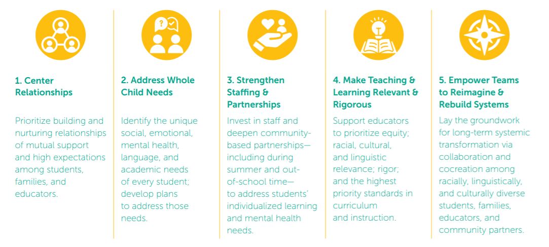 Rebuilding and recovery must begin by nurturing students’ and educators’ social and emotional well-being to support academic progress. But it should go farther by reimagining the very systems in which students learn. This includes strengthening the foundation of our education system and all child- and family-facing systems to eradicate systemic racial and other inequities; to build trust between and among students, families, educators, administrators and leaders; and to strengthen systems for continuous improvement.