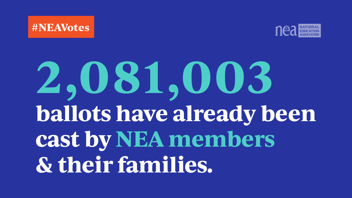 “As educators, we know that our democracy only works if every vote is counted. Whether we are Black or white, Native or newcomer, Latino or Asian, we know that for democracy to work for all of us, it must include us all. And we know that in order to transform our public education system into one that is racially just, socially just, and equitable so every student can succeed – our democracy must succeed,” says NEA President Becky Pringle. “That is why, on behalf of the 3 million educators represented by the National Education Association, we have released our #CountEveryVote, making clear our commitment to protecting our democracy by ensuring every vote is counted in this election.”