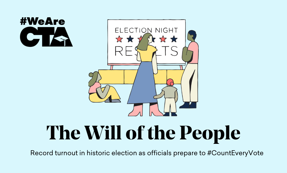 With widespread national concerns about potential efforts to silence voters and have ballots thrown out, CTA joins NEA and other state affiliates across the country in pledging to ensure every vote is counted. Nationwide, NEA leaders will be working with state officials to make certain the election is safe, fair and decided by voters.