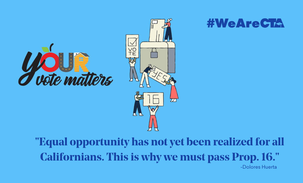 “We must recognize the roadblocks within our systems and make every effort to clear the path for equal opportunities for women and people of color,” says CTA President E. Toby Boyd. “Prop. 16 is necessary to help prevent discrimination by reinstating equal opportunity for all, laying the foundation for every student to achieve their dreams and define their own limits.”
