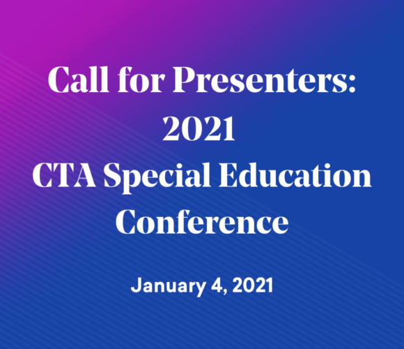 Thank you for your interest in presenting at the first ever 2021 CTA Special Education Conference -Home Edition! The deadline to apply is Monday, January 4, 2021.