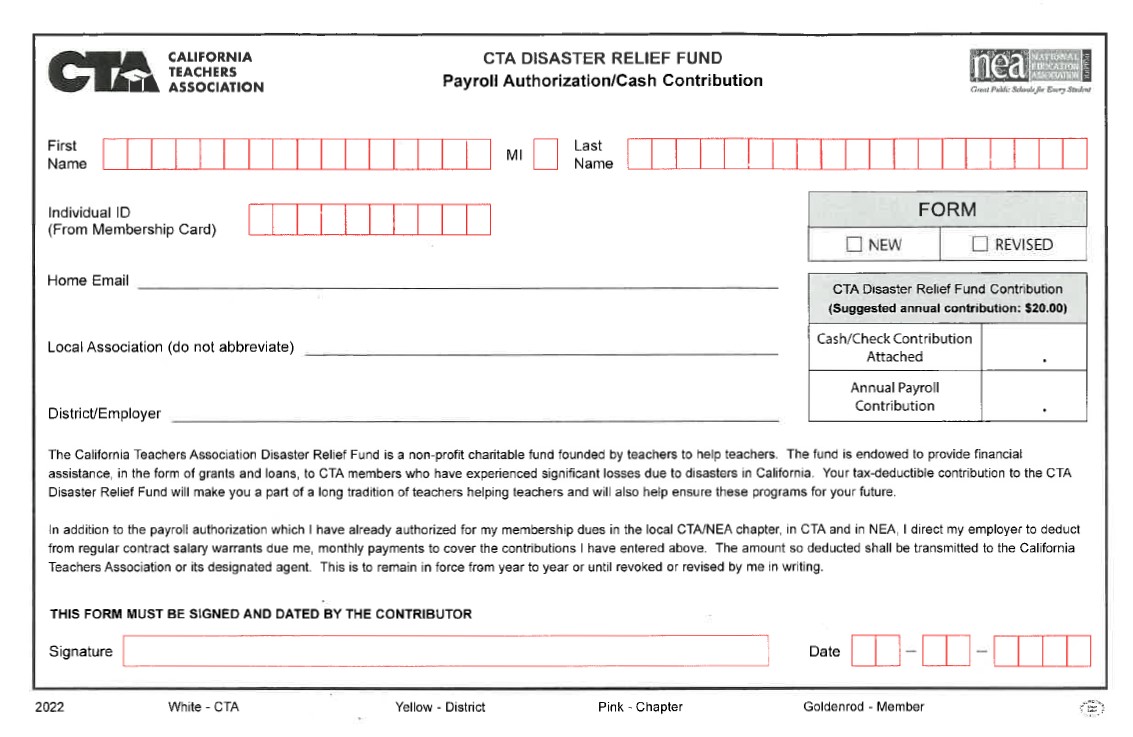 CTA Disaster Relief Fund Contribution Form – The Disaster Relief Fund provides financial assistance to CTA members who have experienced significant losses due to natural or other disasters in California.