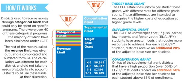 School districts used to receive money through categorical funds that could be spent on specific programs. There were over 40 of these categorical programs, the majority of which were eliminated under LCFF. The rest of the money, called the revenue limit, was given out using a complicated and outdated formula. The calculation was different for each district and did not take the needs of students into account. Districts could use these funds at their discretion.