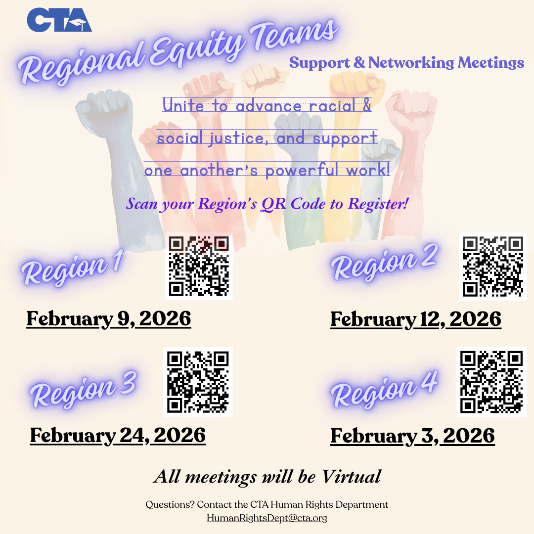 Our Equity Team Meetings are created especially for CTA local chapter equity teams and/or social justice committees to provide members with an opportunity to meet equity teams across the state, develop strategies on how to strengthen their team, and share ideas about racial and social justice programming.