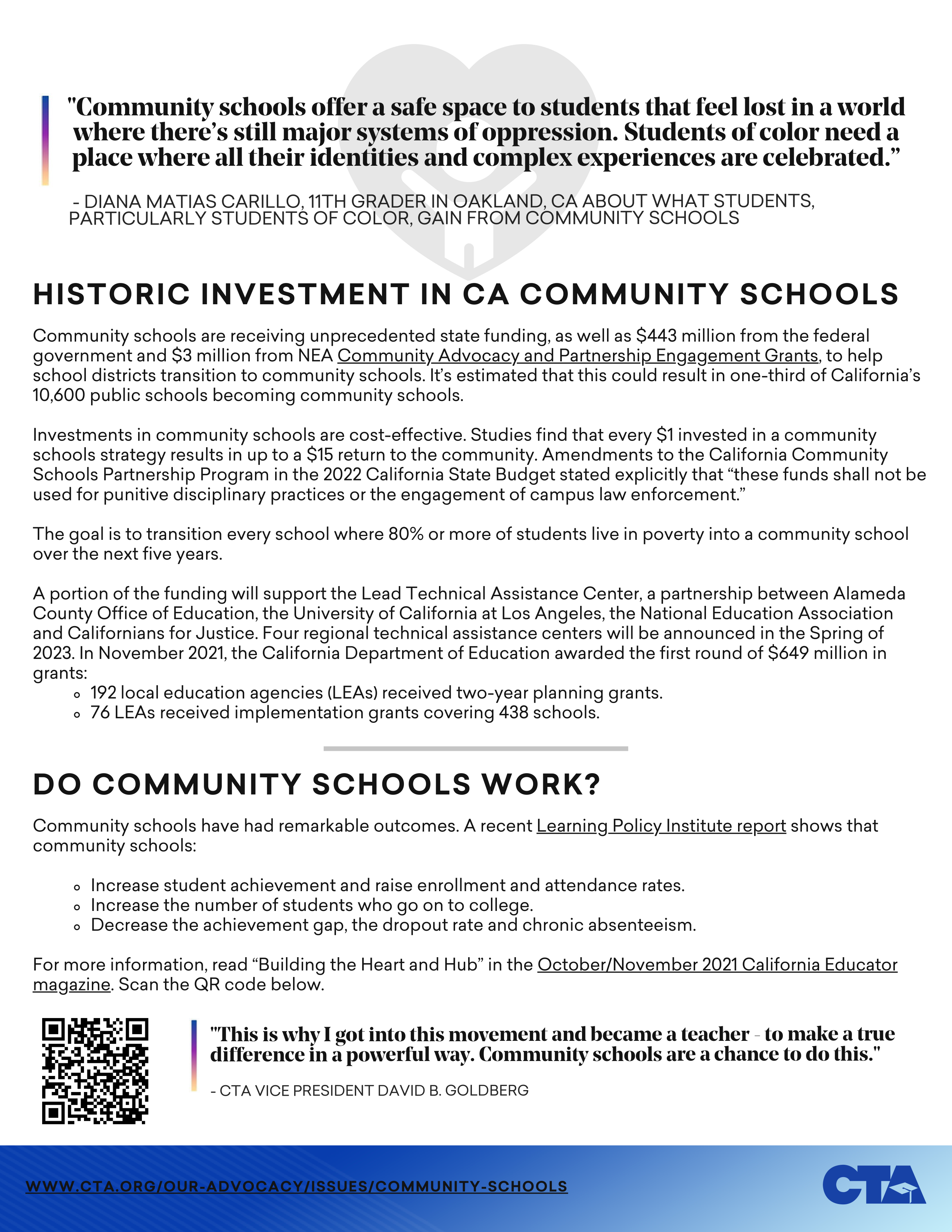 “Community schools are collaboratively imagined and democratically run public schools designed to meet the unique needs of local students. Through authentic governance structures and a bottom-up approach, educators, students, parents and community organizations utilize a model of shared decision making to provide academic, emotional and community support for student success,” said CTA President E. Toby Boyd. “Today’s actions across California show that educators are deeply committed to Community Schools, and that they are standing up to ensure their voices and those of parents, students and the community are heard.”